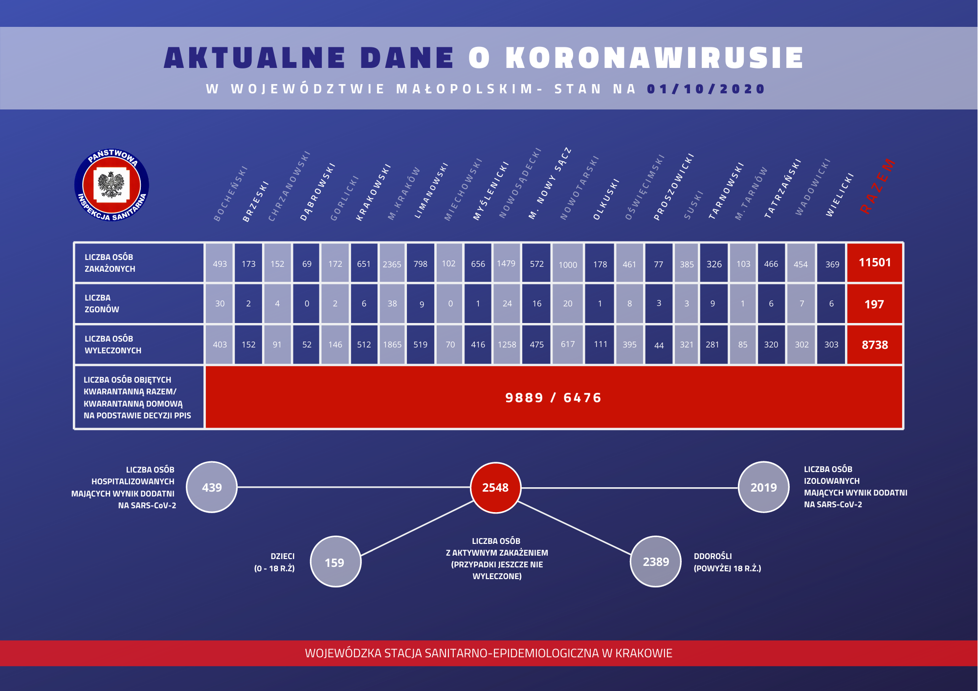 Przekazujemy informację Małopolskiego Państwowego Wojewódzkiego Inspektora Sanitarnego o sytuacji epidemiologicznej w Małopolsce według stanu na dzień 1.10.2020 r., godz. 8:00. Szczegóły w załączniku.